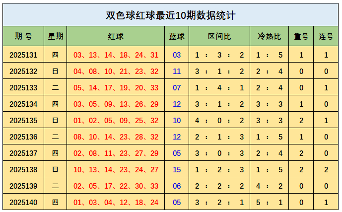 上期回顾:双色球第2025140期开出奖号:红球01、03、04、12、18、24;蓝球05,其中红球三区比为3:2:1,开出0枚重号,开出1组连号03、04,蓝球开出二区号码05。
